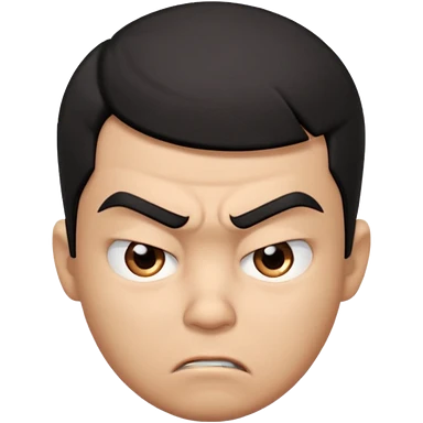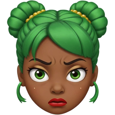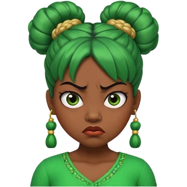 Create a 3D cartoon-style girl character with dark skin, round face, angry expression, big wide eyes, and tightly styled double buns made of green beaded hair. The girl should look irritated, eyebrows sharply angled, and lips pressed in a frown. emoji | AI Emoji Generator