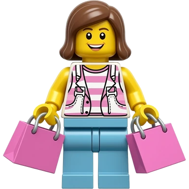 Create a lego minifig carriying shopping bags. It should be a female and she should be very happy. Make the bags pink emoji