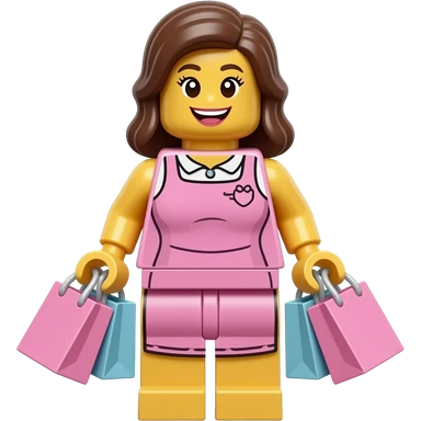 Create a lego minifig carriying shopping bags. It should be a female and she should be very happy. Make the bags pink. she should wear a dress emoji
