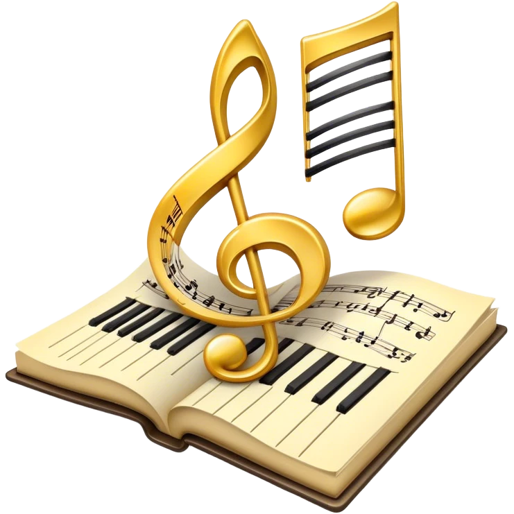 Create a bright and artistic emoji that represents music composition. The design should feature musical notes, a pencil or quill, and a sheet of music, symbolizing the creative process of composing a song. Add a touch of elegance with flowing lines to represent melody and rhythm. Incorporate piano keys arranged like a ribbon or flowing tape, symbolizing the piano's role in composition. Use gold or silver tones for sophistication, and incorporate vibrant colors to convey creativity. The background should be transparent.emoji