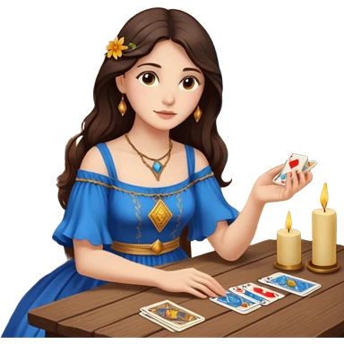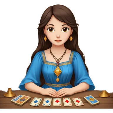 Create a brunette girl with brown eyes sitting at a table with tarot cards. emoji | AI Emoji Generator