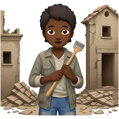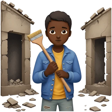 Character brushing dust off themselves as ruins fall behind emoji