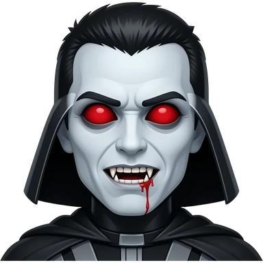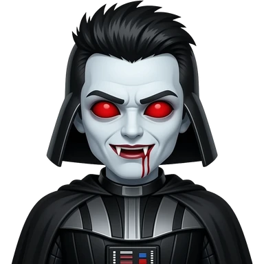 create a picture of a white pale vampire with full red sclera with no pupil and long fangs and bloody mouth and very short black hair with an edgy punk haircut and darth vader outfit without his mask, the clothes only emoji