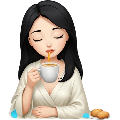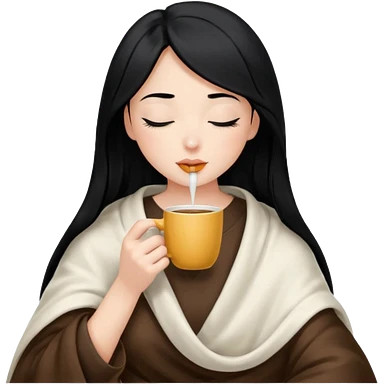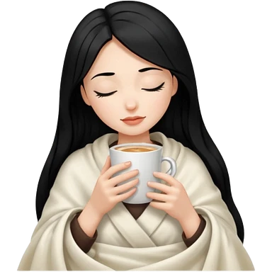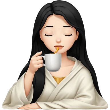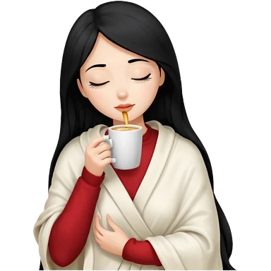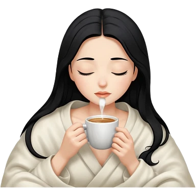 black hair girl long hair inside a white milky satin blanket sipping coffee eyes closed emoji