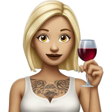 Create a hyper-realistic emoji of a blonde woman with tattoos, holding a glass of wine in one hand and pointing forward with the other, with an elegant and minimal design. emoji | AI Emoji Generator