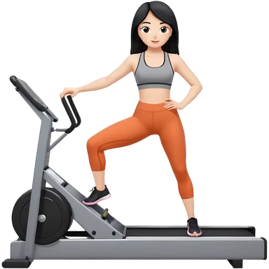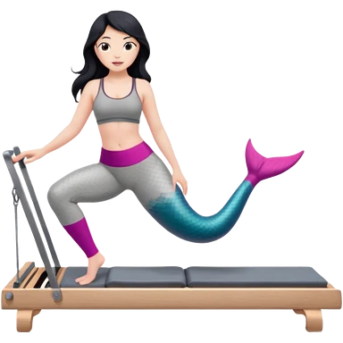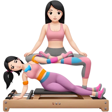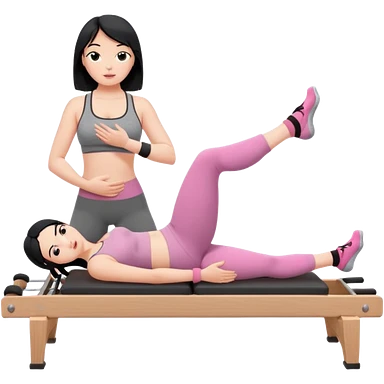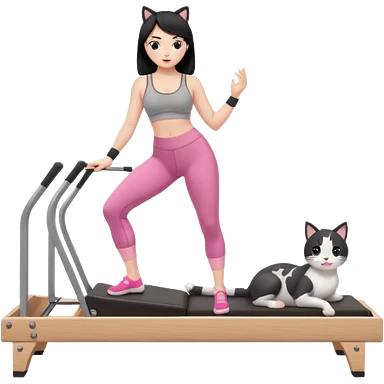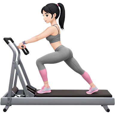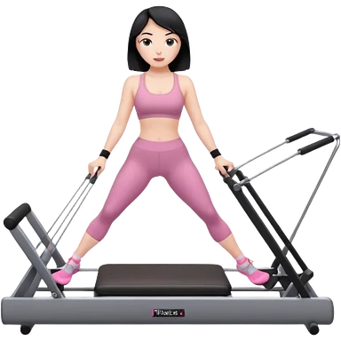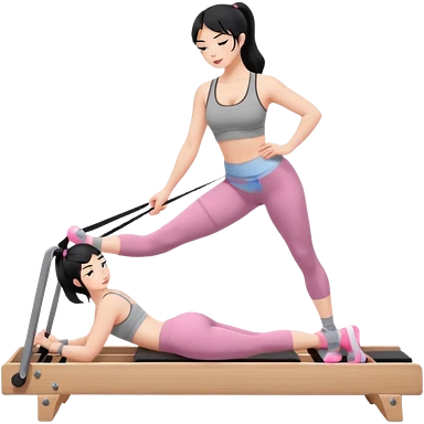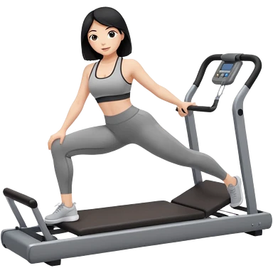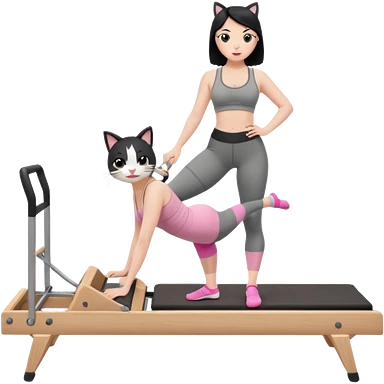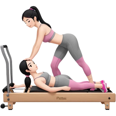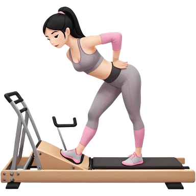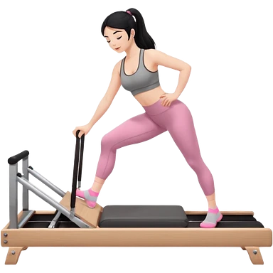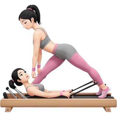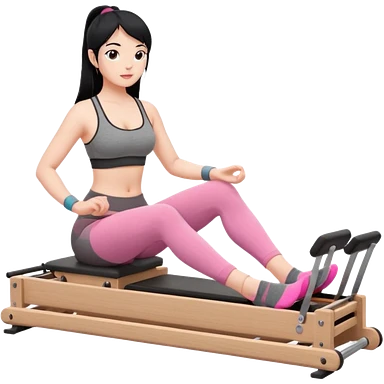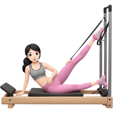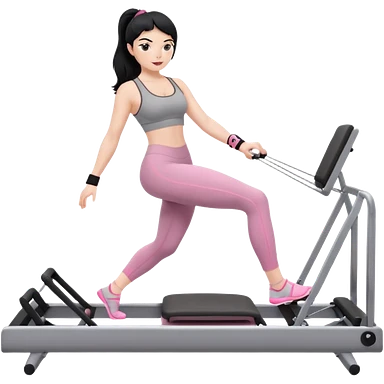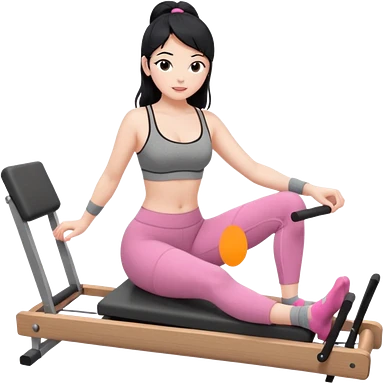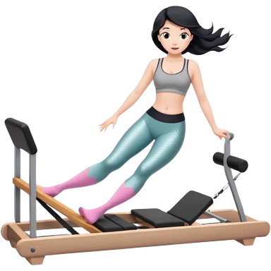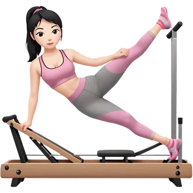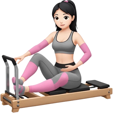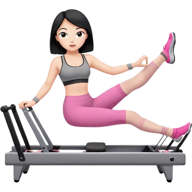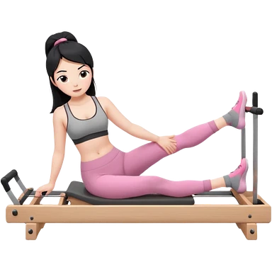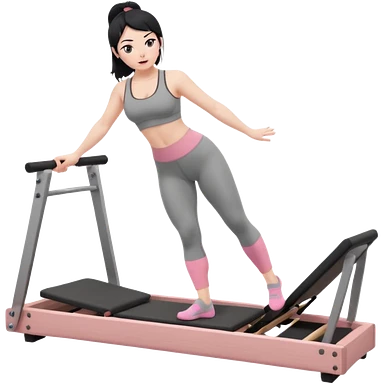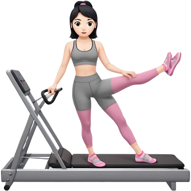 Create a Pilates emoji: a girl with fair skin and black hair, wearing a grey bra and grey leggings with pink pilates socks, exercising on a pilates reformer and not looking at the camera emoji | AI Emoji Generator