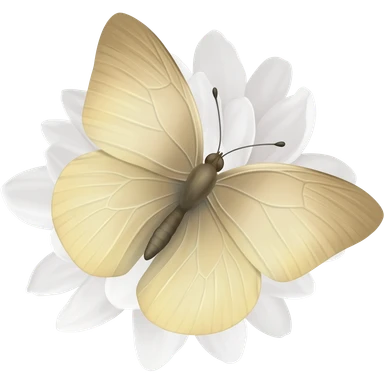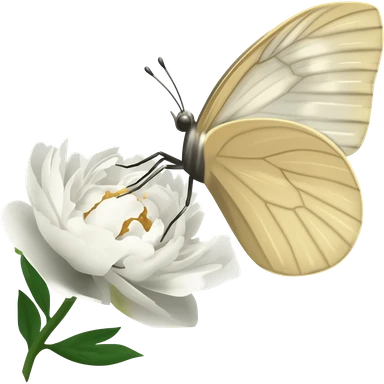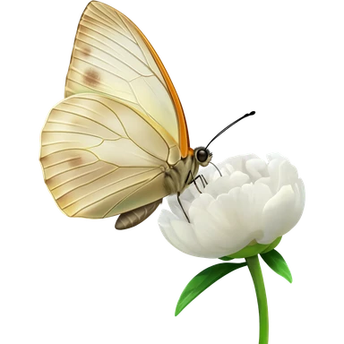 A beautiful light beige butterfly sits on a white peony emoji