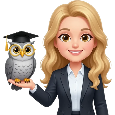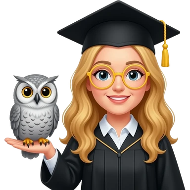 a teacher with long wavy blond hair with a grey owl in a black graduation cap with a yellow tassel, in round yellow glasses on the right hand emoji
