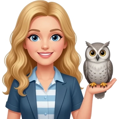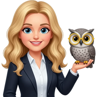 a teacher with long wavy blond hair with an grey owl on the right hand emoji