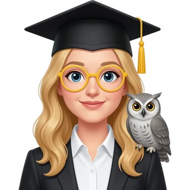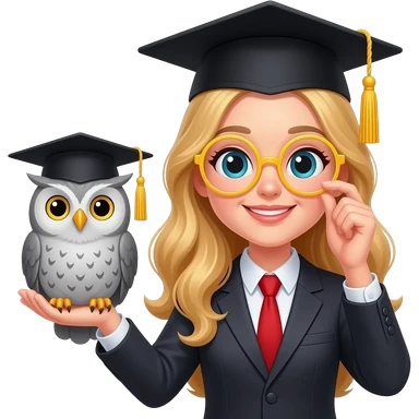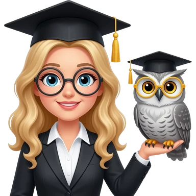 a teacher with long wavy blond hair with a grey owl in a black graduation cap with a yellow tassel and in round yellow glasses on the right hand emoji
