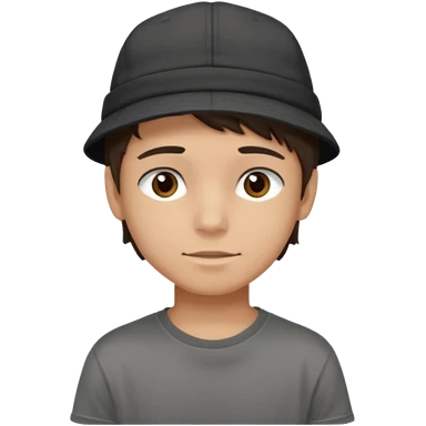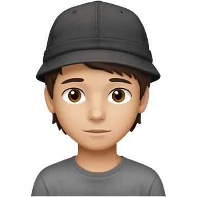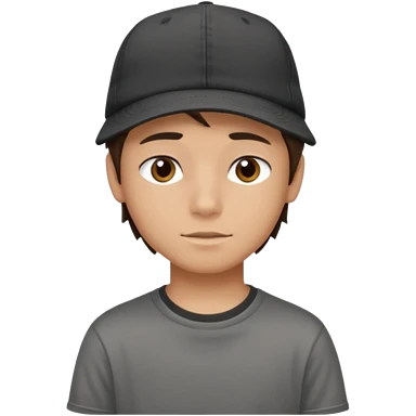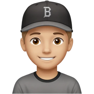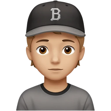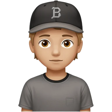 Create a teen boy wearing a faded black T-shirt. He will have light brown hair that is buzzed, tan skin, and dark brown eyes. He is wearing a gray baseball hat turned backwards. emoji | AI Emoji Generator