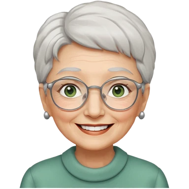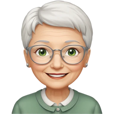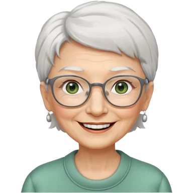 Create me emoji of an old lady. Short white hair to left side. Square glasses. Gray-green eyes. Big smile. emoji