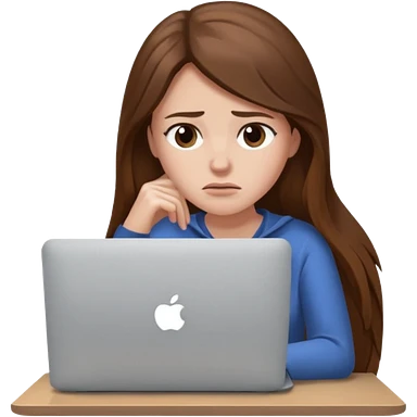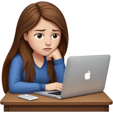 create a woman long hair brown, sitting with her macbook looking tired. looking at her computer, exausted emoji