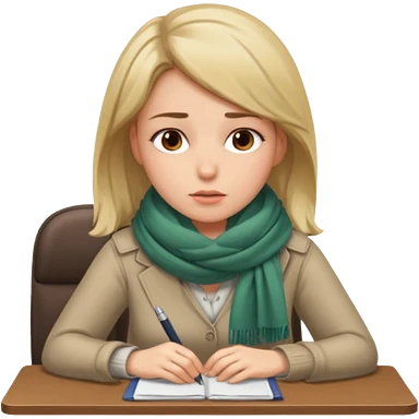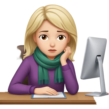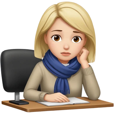 Person sitting at desk, looking tired, winter outside, woman emoji