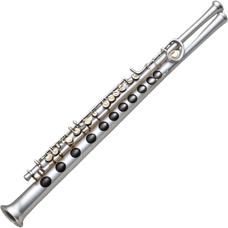 Create an elegant and refined emoji representing a classical silver flute. The design should showcase the sleek, polished silver body of the flute with its keywork and tone holes clearly visible. Highlight the smooth, straight shape of the instrument with subtle light reflections on its metal surface. The keys should be delicately detailed, with their small, round pads visible. Add a slight shine to the flute’s surface to reflect its high-quality craftsmanship. Optionally, include subtle musical notes floating around the flute to evoke its light, melodic sound. The background should be transparent.emoji