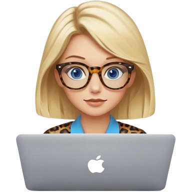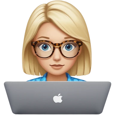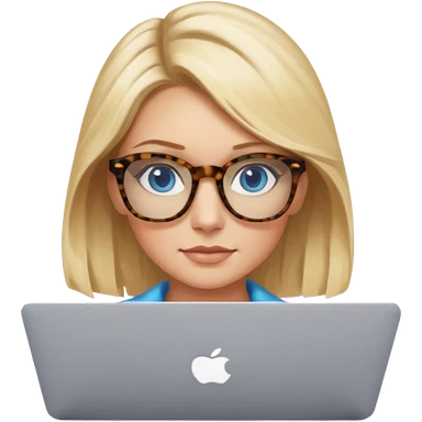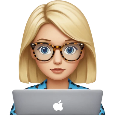 blonde hair woman blue eyes with tortoise shell print glasses on mac book emoji