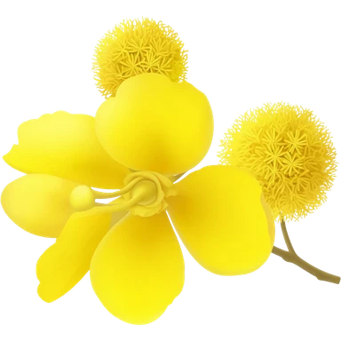 mimosa blossom cluster, round fluffy yellow flowers with tiny filaments, slender green stems, delicate feathery leaves, vibrant and soft spring bloom, no vase or extras, apple emoji style, soft lighting, transparent background, emoji scale emoji