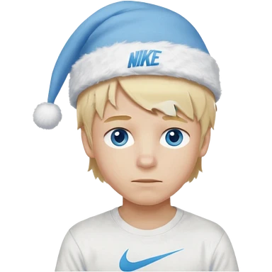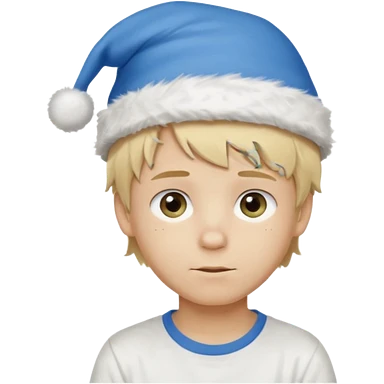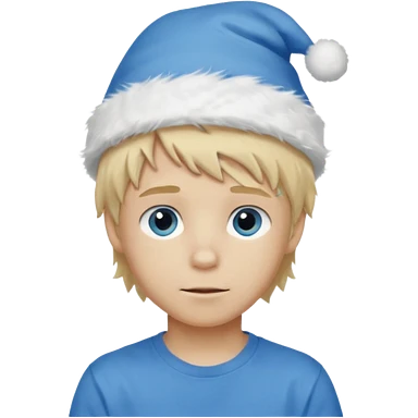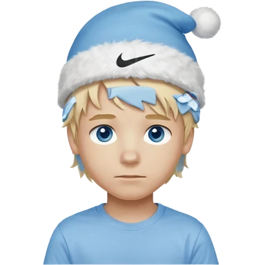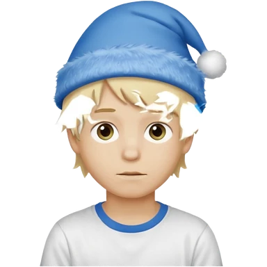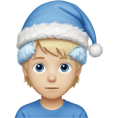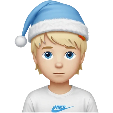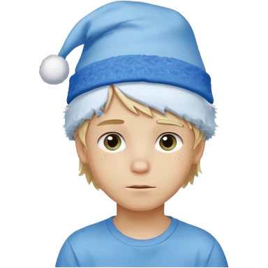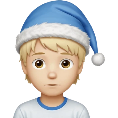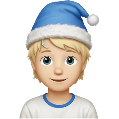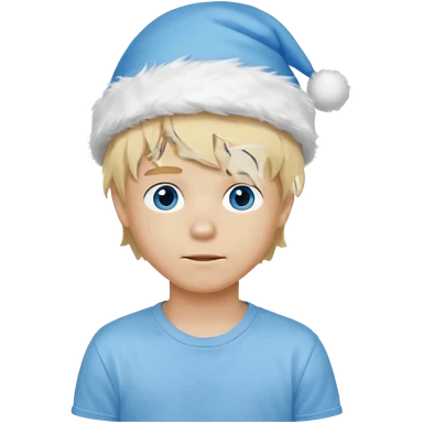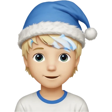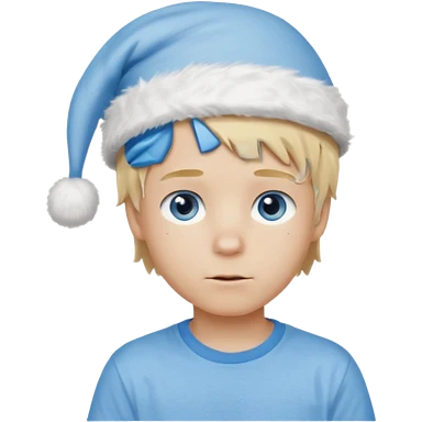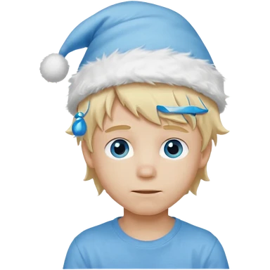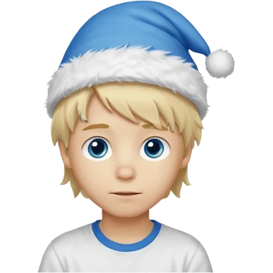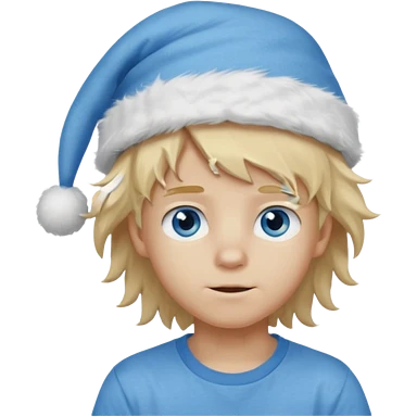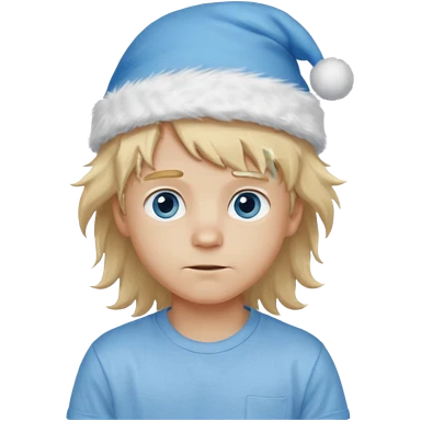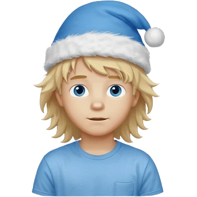 create boy blonde hair long messy, light eyes, white t shirt, rich, long hair, eyes blue, acessory head cristimas blue hat, fluffy hair medium long hair emoji | AI Emoji Generator