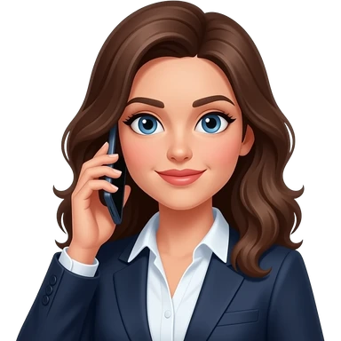 hot brunette sales director who is very cool and wears stylish clothes, blue eyes, holding a phone emoji
