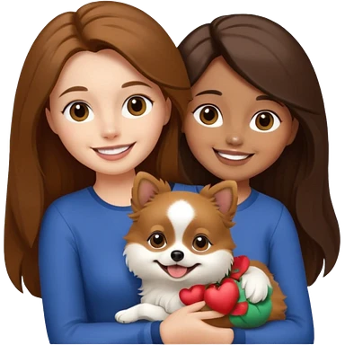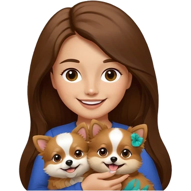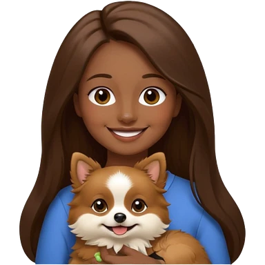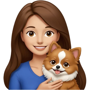Create a high-quality emoji illustration of a woman with long brown hair, smiling, holding a small Pomeranian dog. The dog’s face is mostly black with a white line centered from the nose to the mouth. Minimalist emoji style, smooth lines, bright but natural colors.” emoji