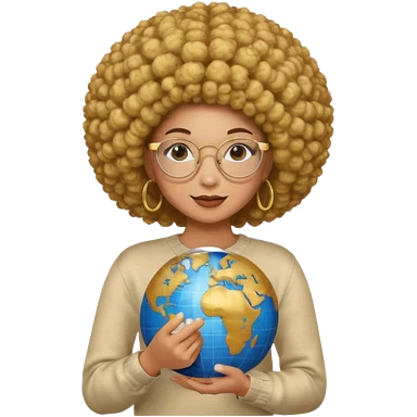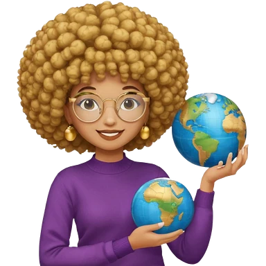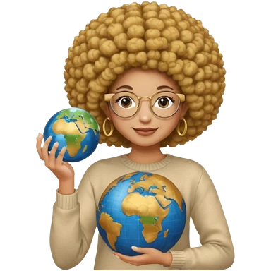 a young woman wearing gold round glasses and afro hair, she has medium/mate skin, she's wearing a sweater and she's holding a globe in her hand emoji