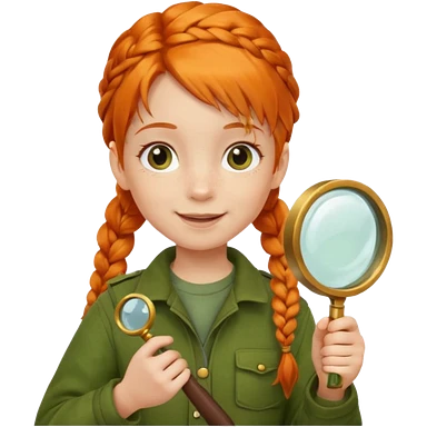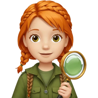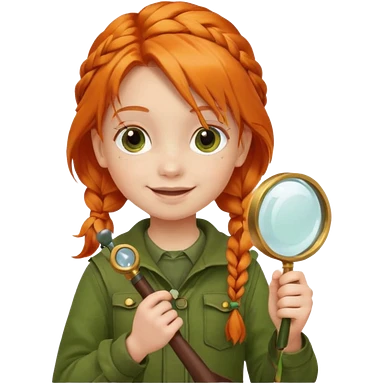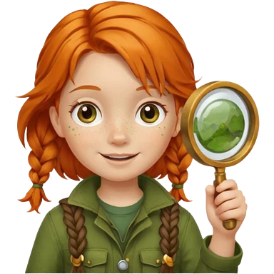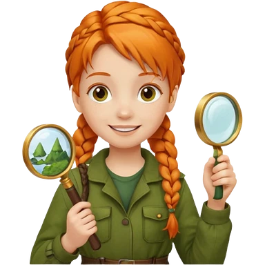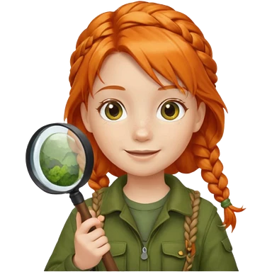 braid orange haired girl kid in moss green explorer outfit, holding magnifying glass, smile emoji