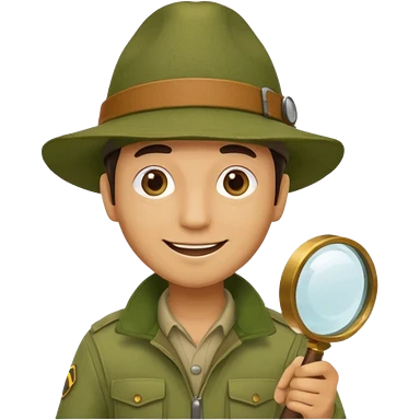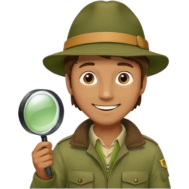 man in beige moss green explorer outfit, hat, holding magnifying glass, smile emoji