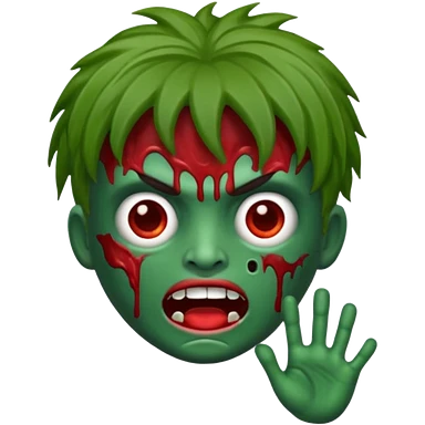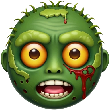 emoji de zumbi realista estilo 3D, pele verde podre, cicatrizes, olhos brilhando, expressão assustadora, fundo transparente emoji