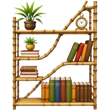 Twisted bamboo shelving unit with bonsai plants and decorative items emoji