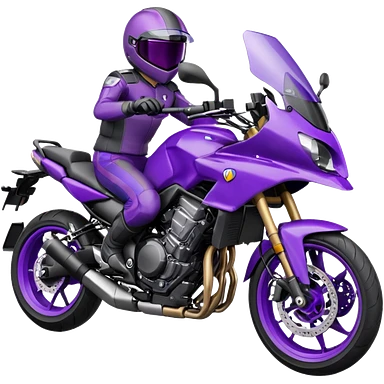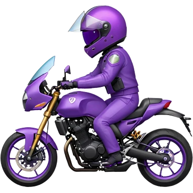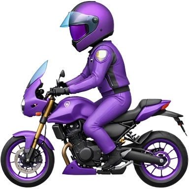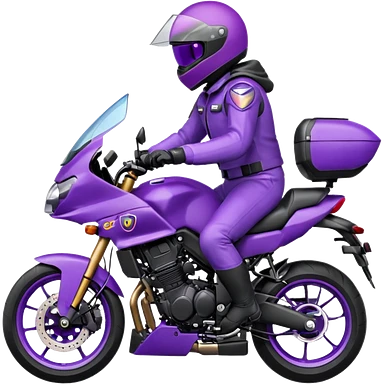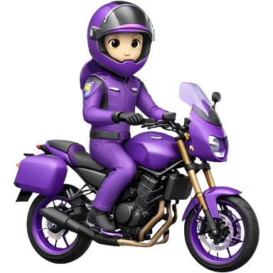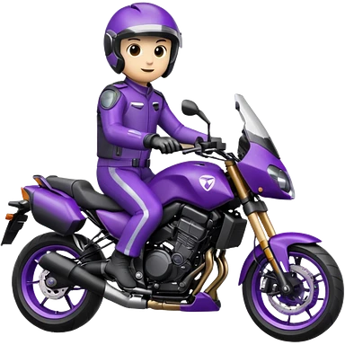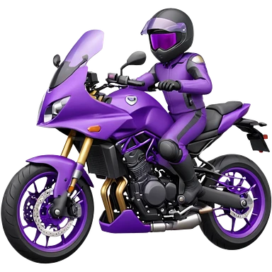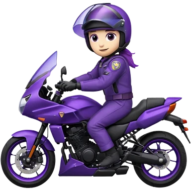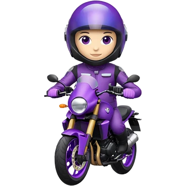 Créer un emoji avec une moto mt07 sport noir mate / violet iridescent très foncé, pare-brise de la moto violet. Avec une femme pilote dessus, visage masqué par la visière violette . Avec en arrière plan cercle violet.emoji