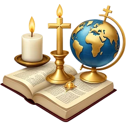 An icon featuring a holy book, a candle, and a cross, symbolizing religious studies. The design includes a globe with various religious symbols: a crescent moon and star (Islam), a lotus flower (Buddhism), representing global belief systems. Transparent background. emoji