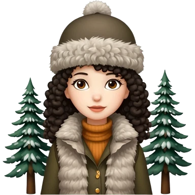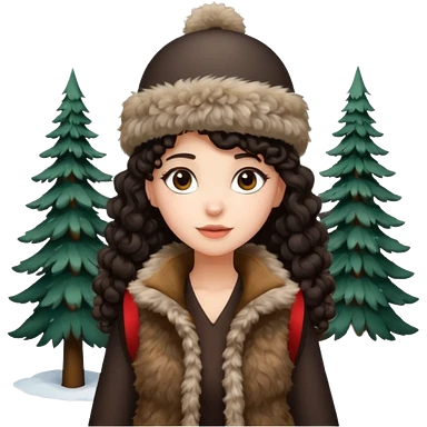 "A girl with curly dark hair 👩🏻🦱, wearing a fur hat 👒🦊 and a fur vest 🧥, standing in the snow ❄️ with pine trees 🌲 in the background. Minimalistic emoji style." emoji