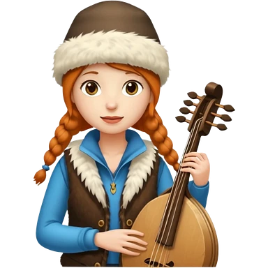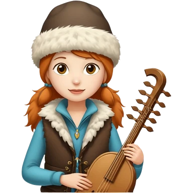 "Girl 👩🏻🦱 in fur hat 👒🦊 and vest 🧥, standing in snow ❄️🌲, holding a Bashkir dombyra 🎶 (long-necked two-string folk instrument). Emoji style." emoji