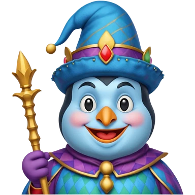 crazy colorful little penguin jolly joker, medieval, vintage, court jester, mac os icon, blue color emoji