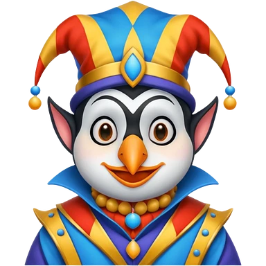 crazy funny colorful penguin jolly joker, medieval, vintage, court jester, mac os icon, orange color emoji