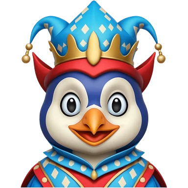 crazy colorful neutral penguin jolly joker, medieval, vintage, court jester, mac os icon, blue color emoji