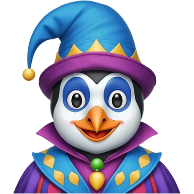 crazy funny colorful real penguin jolly joker, medieval, vintage, court jester, mac os icon, blue color emoji