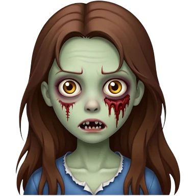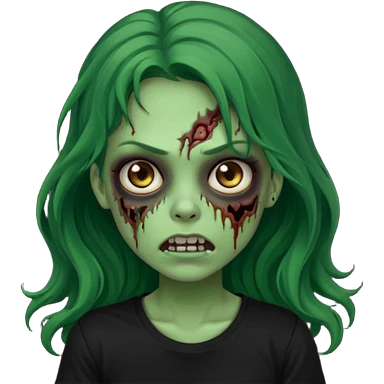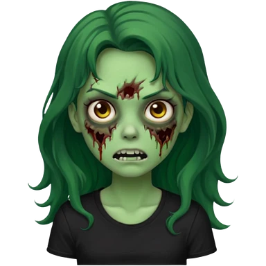 crie um emoji de uma garota zoombie pele verde e cabelo castanho, assustadora e fofa com cabelo ondulado 2b e camiseta básica preta emoji | AI Emoji Generator