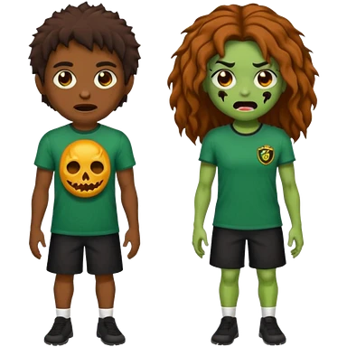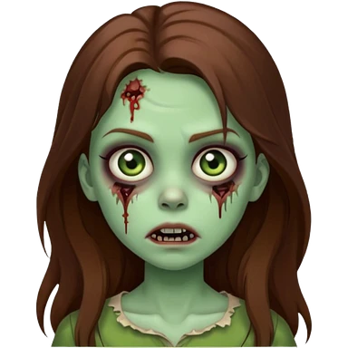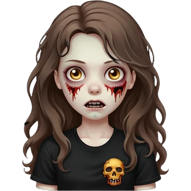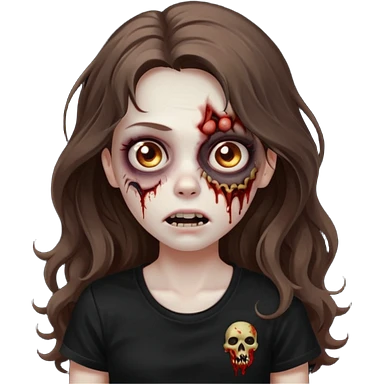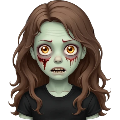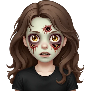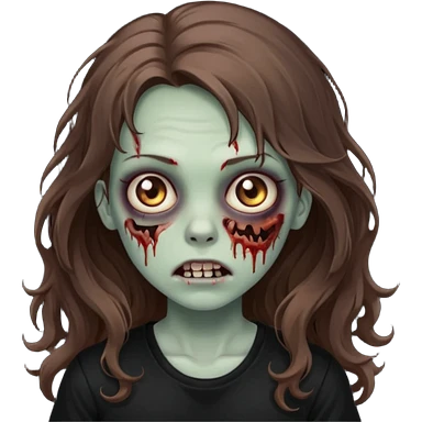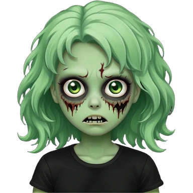 crie um emoji de uma garota zoombie pele verde e cabelo castanho, assustadora e fofa com cabelo ondulado 2b e camiseta básica pretaemoji