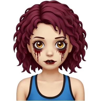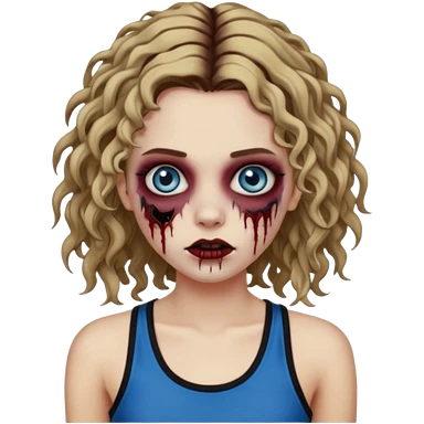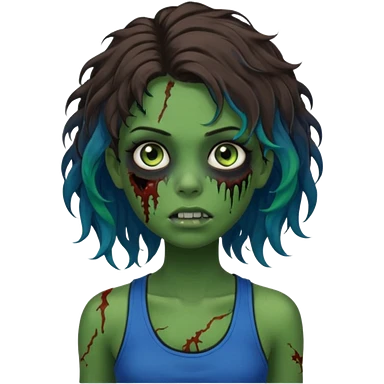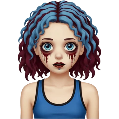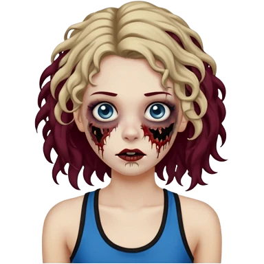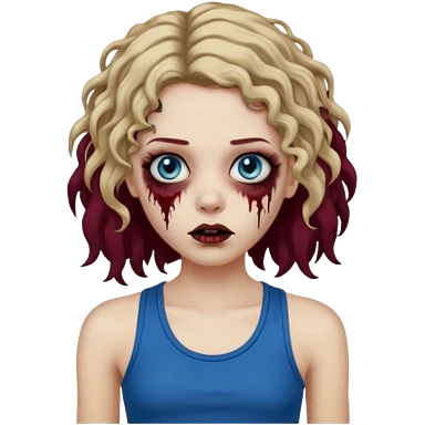 Crie um emoji de uma garota zumbi, como esta: "🧟‍♀️'. Porém invés da camiseta, uma regata fina e de cor preta, os cabelos loiros escuros na altura do ombro e picotado, liso na raiz e cacheado nas pontas, com mechas azuis na frente e a parte de trás pintada de vermelho vinho emoji | AI Emoji Generator
