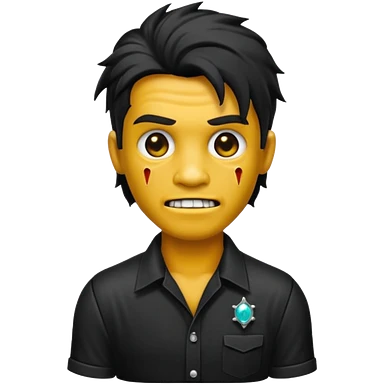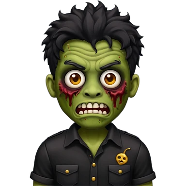 Emoji masculino de zumbi estilo iPhone,com cabelo ondulado mullet e preto, camisa preta e brincos emoji