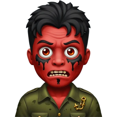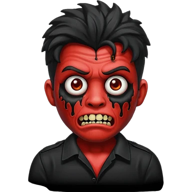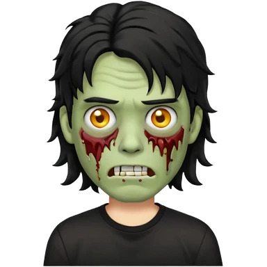 Crie um zumbi com sangue estilo emoji do iPhone com cabelo ondulado grande preto com camiseta preta e óculos de grau preto emoji
