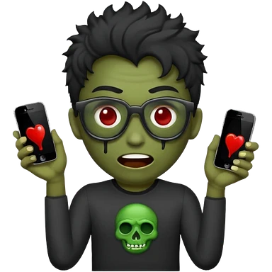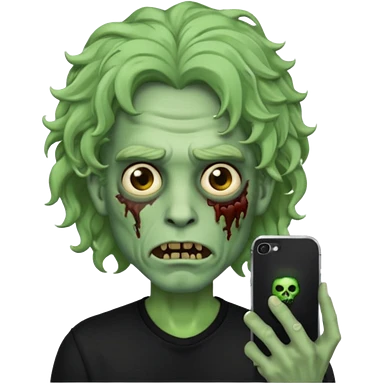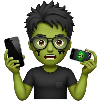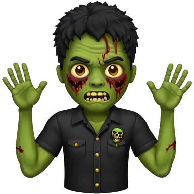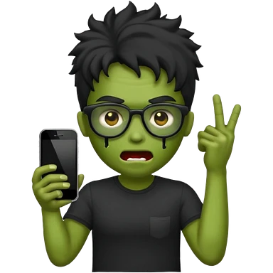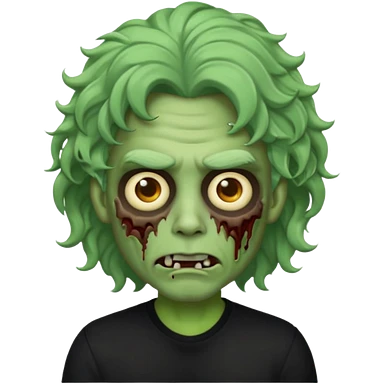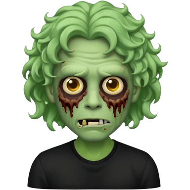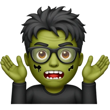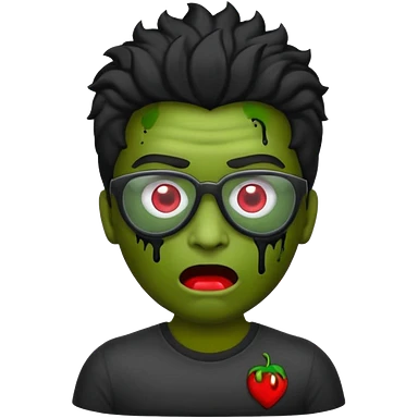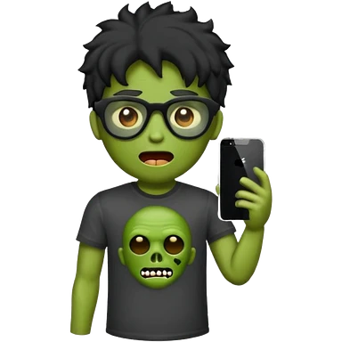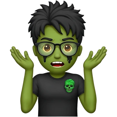 Crie um zumbi estilo emoji do iPhone com cabelo ondulado masculino com camiseta preta e óculos de grau preto emoji | AI Emoji Generator