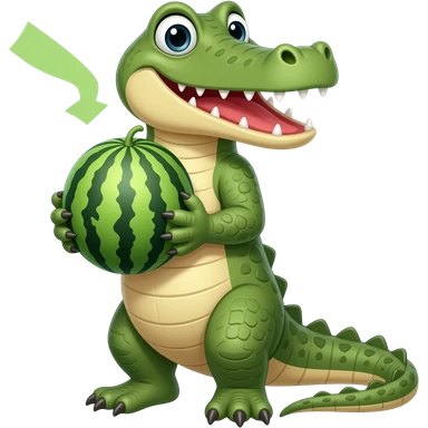 Crocodile resting, surrounded by rocks, water, and tropical plants. The green scales of the crocodile glisten under the light, with its sharp eyes focused ahead. The background features a naturalistic habitat with plants and water, giving it a lifelike feel. emoji | AI Emoji Generator