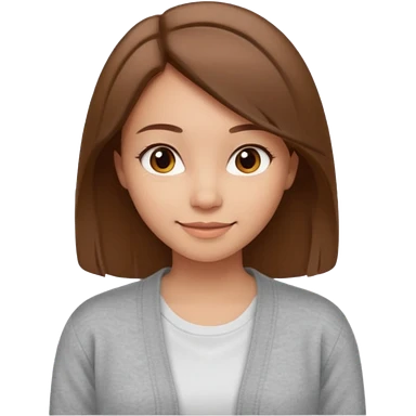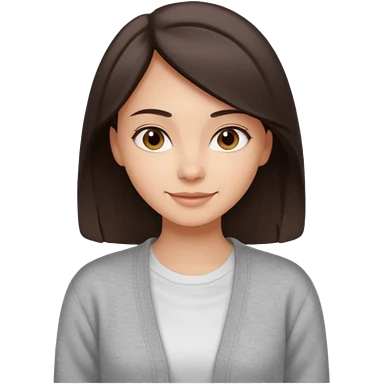 The girl has straight medium-length dqrk brown hair, light skin, wearing a white t-shirt and gray cardigan. Gentle smile, friendly neutral expression emoji