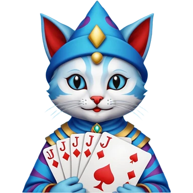 crazy colorful cute little cat jolly joker from poker, medieval, vintage, court jester, mac os icon, blue color, holds poker cards (clearly detailed and precise) emoji