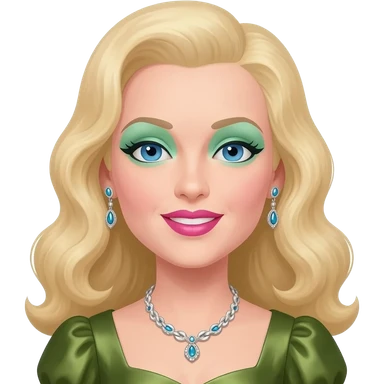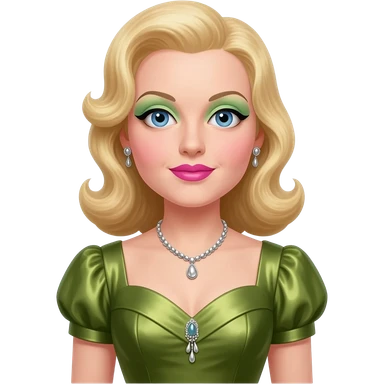 Patty Andrews from The Andrews Sisters with sapphire blue eyes, long blonde hair, light green eyeshadow, pink lipstick, olive metallic queen anne dress, silver necklace and earrings emoji