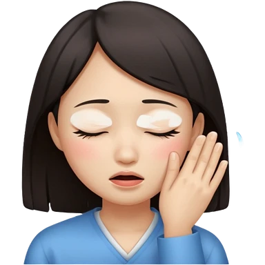 A crying East Asian woman with black hair, wearing light blue clothing. Her skin appears dry, closing her eyes and crying emoji