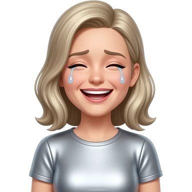Create an emoji of a seated woman in metallic silver. The woman is making a laughing-crying face expression. The background is white. The final result must have maximum resolution, high contrast, and extreme sharpness. Illustration style: Vintage – Art Deco – 2D emoji