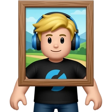 Funny Roblox avatar emoji, character with a wooden picture frame around the head, face inside a painting frame, blond hair with blue headphones, black shirt with blue design, dark pants, white hands, quirky and creative style, 3D cartoon emoji, cute gaming style, bright lighting emoji